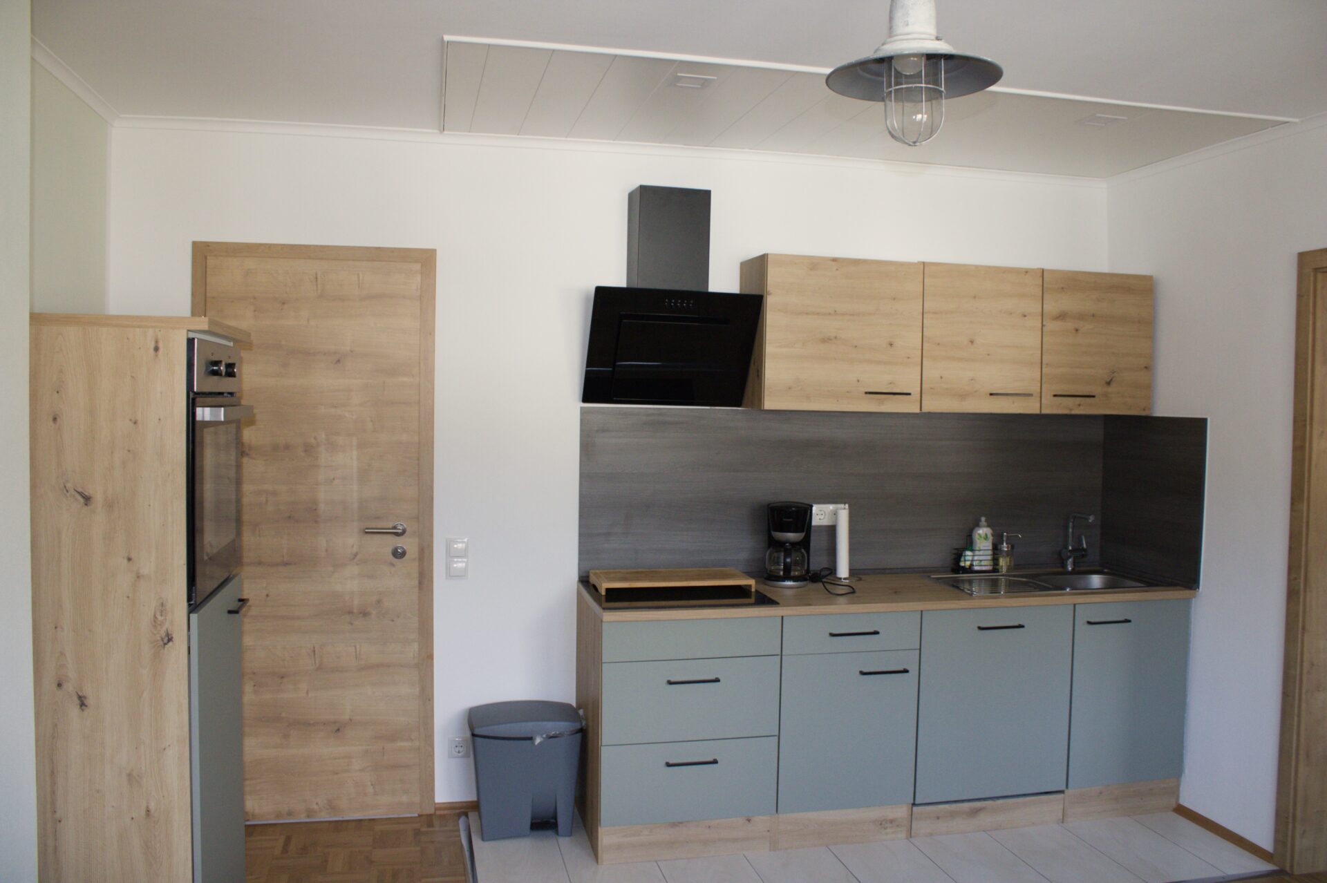 - Einbauküche mit Kühlschrank, Gefrierfach, Mikrowelle, Spülmaschine, E-Herd, Kaffeemaschine, Toaster, Wasserkocher, Staubsauger